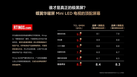 在国际权威评测机构Rtings的评测中,与T7L Ultra搭载同款万象分区技术的TCL产品,在屏幕均匀性和光晕对比测试中,无论是黑色均匀性还是光晕控制,均获得了近乎满分的9.9分,直接超越同级产品。