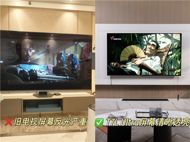 以前白天看剧,总在拉窗帘和忍反光之间纠结。拉帘闷得慌,不拉帘屏幕上全是窗户和灯光的光斑,连演员的表情都看得模模糊糊。但用上T7L Ultra就再也没有这种苦恼,不管是正午阳光斜照,还是客厅开着主灯,屏幕都能保持干净透亮,没有刺眼的反光干扰。