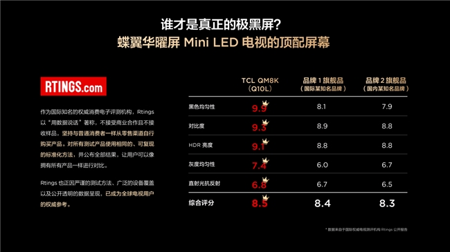 国际权威评测机构Rtings的测试结果为此提供了有力佐证:TCL凭借万象分区技术在黑色均匀性上拿下惊人的9.9分,而国内另一品牌旗舰机即便堆砌了更多分区数量,却仅获得7.9分。这不仅是数字层面上的差距,更是TCL底层光控技术的实力体现。