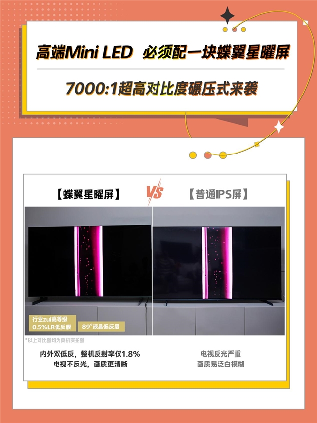 市面上不少同价位电视用磨砂膜叠加低反的AGLR屏来解决反光,虽然能消除部分反射,但画面依然泛白,整体画质牺牲明显,只称是“妥协方案”。而TCL T7L Ultra全系搭载的蝶翼星曜屏,采用镜面低反黑科技,覆盖行业最高等级的0.5% LR低反膜,配合89°液晶内低反设计,整机反射率低至1.8%,远低于AGLR屏宣传的2.6%。T7L Ultra真正将高端抗反光带入万元内主流价位,让用户白天不拉窗帘也能沉浸看片,再强的环境光也干扰不了演唱会现场的每一帧精彩。
