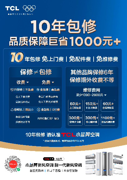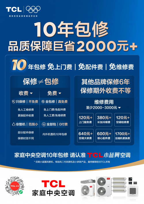 值得关注的是,TCL空调推出“十年包修”服务,凡是购买TCL家用空调小蓝翼系列、家中空调小蓝翼风管机、恒劲风二代风管机及小多联、真省电pro等产品的用户,均可享受整机10年免费包修服务,全免费包括上门费、零件费、检修费和人工费,且使用原厂配件和工艺,由厂家直接负责。这一服务周期几乎覆盖了产品的全生命周期,真正实现“一次购买,十年安心”。
