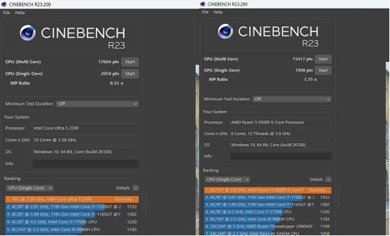 在消费级处理器市场中,受众基数庞大的千元级细分领域,因承接主流用户对性能与成本的平衡需求,始终是AMD与英特尔两大头部厂商竞争最为激烈的核心战场之一。该价位段产品不仅需满足日常应用场景,更要在游戏、轻度生产力等需求中展现适配能力,其市场表现对厂商整体用户覆盖至关重要。2025年初,英特尔率先针对中国市场推出特供版处理器酷睿Ultra 5 230F,精准切入千元级市场,试图通过本地化产品策略巩固竞争优势;而近期,AMD也紧随其后,推出锐龙5 9500F处理器,且同样将目标锁定于这一高关注度价位段,形成直接对标态势。两款产品同属主流定位、面向相似用户群体,其实际性能表现的差异成为市场与用户关注的焦点。那么,在具体的实测场景中,这两款千元级处理器的综合表现究竟如何,各自又具备哪些优势与特点?
