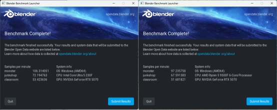 除此之外,我们还简单测试了英特尔酷睿Ultra 5 230F平台与AMD锐龙5 9500F平台在生产力方面的表现——可以看到前者无论是在面向生产力综合能力测试的CrossMark还是面向模型渲染的Blender Open data中,均有一定的优势。要知道英特尔酷睿Ultra 5 230F平台还有NPU可以利用,其与顶级处理器酷睿Ultra 9 285K拥有一致的完整NPU单元,能够帮助用户更好地应对AI应用。