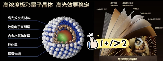 SQD-Mini LED 就不一样了,它是用蓝色 LED 背光去激发超级量子点粒子,从而发出红、绿、蓝三种光。而且它还升级了发光材料和屏幕,用超纯净蓝光搭配高浓度极彩量子晶体,先混成超高纯度的白光,再通过超级蝶翼华曜屏的晶粹高色阻滤掉杂光。这套组合拳下来,不管是看单色画面还是复杂的多色场景,色彩都能保持纯净透亮,100% BT.2020 高色域是真・全程在线,没有一点水分。