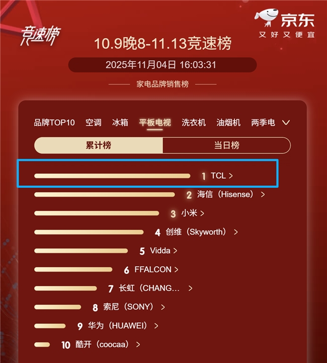 今年双十一市场事实上已经给出了回应:TCL电视在品牌销售榜上的持续领跑,这其实正是消费者对SQD-Mini LED最直接且最有说服力的认可。