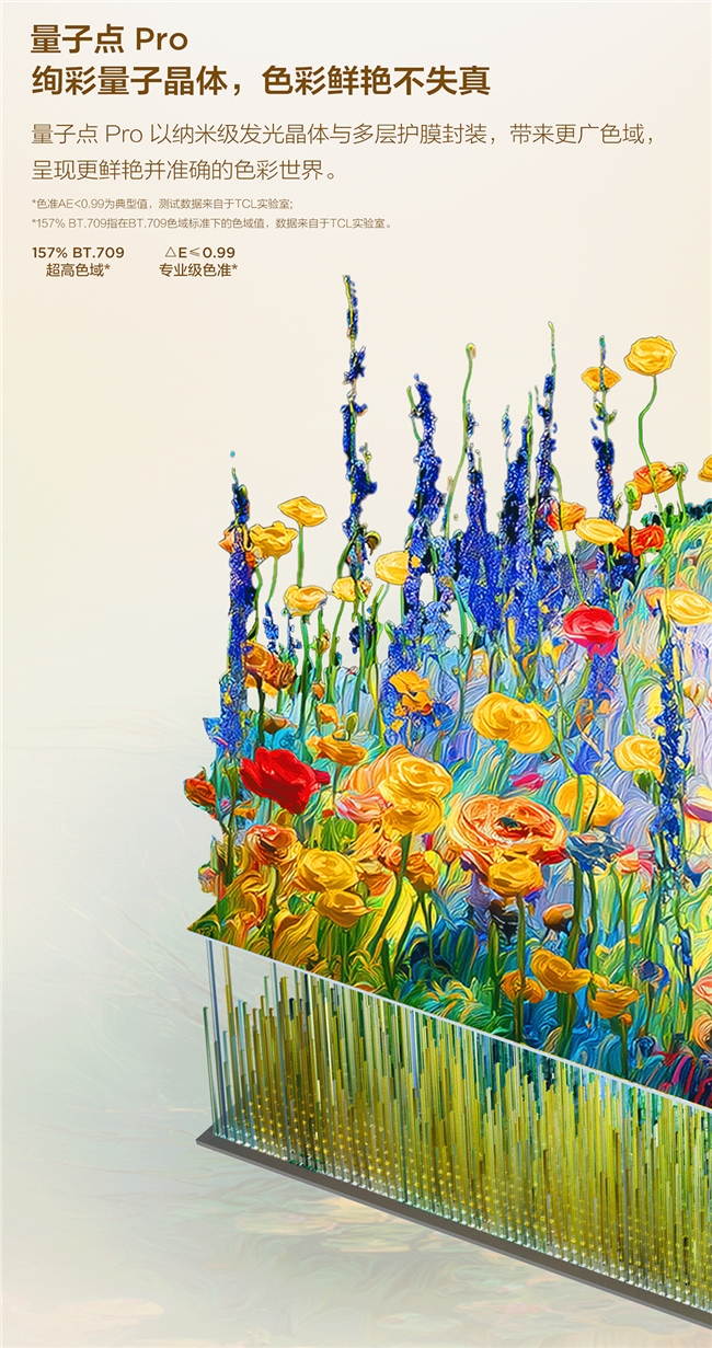 色彩与光感的双重优化,让TCL A400 Pro画面质感更上一层楼,量子点 Pro技术让它实现了157% BT.709广色域覆盖,配合≤0.99的专业级色准,能精准还原自然色彩的本真形态。