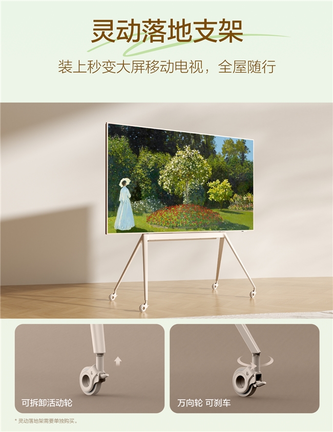 在画质与颜值之外,TCL A400 Pro更以“自由移动”的特性打破空间束缚,这也是它的另一大核心突破。它支持挂装、座装、落地装三种安装方式,标配的灵动落地支架尤为亮眼——画架式底座搭配可拆卸的360°万向轮,让电视能在客厅、卧室、餐厅、阳台等空间灵活移动,彻底打破了传统电视的空间限制。支架上的DIY灵感架,既可以摆放装饰摆件,也能收纳线缆,在提升实用性的同时,进一步延续了产品的美学设计。