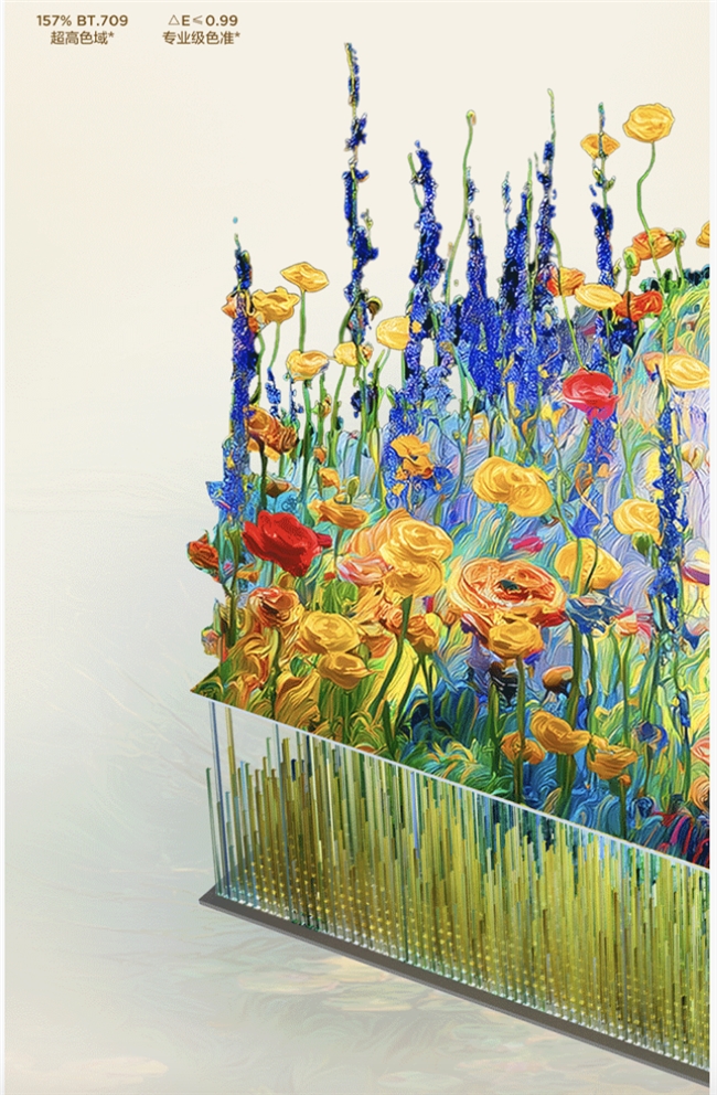 量子点 Pro 技术则为色彩注入灵魂:纳米级发光晶体搭配多层护膜封装,带来 157% BT.709 广色域覆盖与≤0.99的专业级色准,让色彩既鲜艳饱满又真实自然且能更稳定呈现。