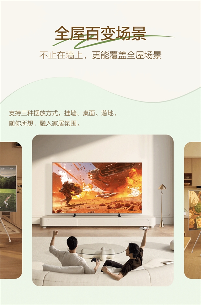 第三重惊喜,是让电视“如影随形”的自由性。A400 Pro 支持挂装、座装、落地装三种安装方式,其中灵动落地支架堪称“空间魔术手”:画架式底座搭配可拆卸的 360°灵动万向轮,轻推即可让电视自由“移动”,无论是餐厅、卧室,还是户外花园、海边,都能随时打造专属观影区。