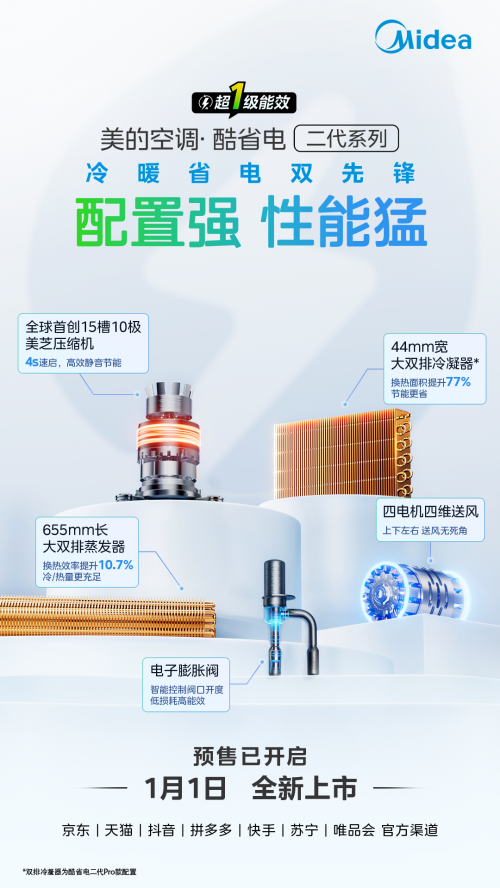 近日,全网销量已突破1000万套、并荣获奥维云网“销量”与“省电”双TOP1认证的美的空调·酷省电系列,迎来里程碑式换代——酷省电二代正式开启预售,并将与2026年1月1日正式上市。