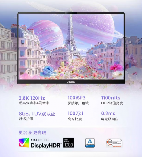华硕a豆14 Air 2026配备14英寸2.8K 120Hz OLED华硕好屏,拥有1100nits HDR峰值亮度,强光环境下也能清晰呈现屏幕内容;具备100% P3影院级广色域、ΔE<1逐台校色高色准并支持四种专业色域切换,色彩细腻丰富,精准呈现本真视界;支持120Hz电竞级刷新率和0.2毫秒疾速响应,保障更丝滑流畅的动态画面;通过硬件级TÜV低蓝光认证,呵护用眼健康。屏幕上方配备1080P+IR摄像头,支持人脸识别登录,让日常使用更便捷高效。