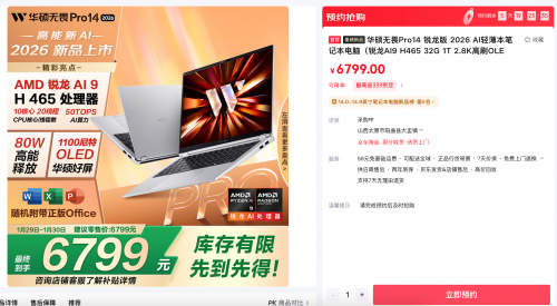 面对生活中的多场景用机需求,当下年轻人换机时更倾向选择一款面面俱到的轻薄实力派,在性能、屏幕、AI、续航等关键维度的体验上切实解决痛点。锐龙AI,解锁AI PC超能力,1月22日新一代华硕无畏Pro14 2026携 AMD 锐龙 AI 9 H 465 移动处理器强势登场,以轻薄机身、80W高能释放、高刷高亮OLED华硕好屏、端云一体AI智能助手、27小时超长续航等多重优势一机全能,无畏挑战。