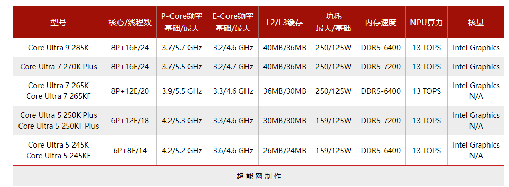 酷睿Ultra 200K系列处理器规格对比
