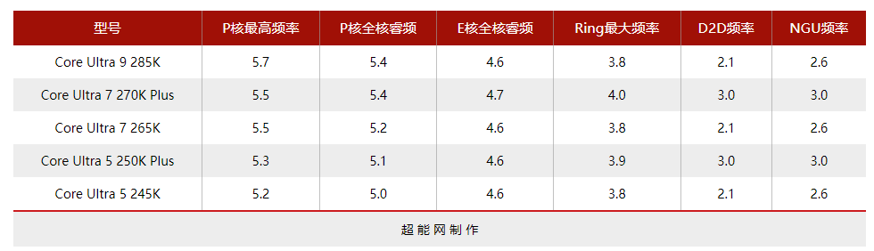 酷睿Ultra 5 250K Plus则是最大睿频与全核睿频都比酷睿Ultra 5 245K高了100MHz。除了核心频率变动之外,两颗Plus处理器的Ring频率、D2D频率、NGU频率都得到了提升,当中D2D和NGU频率均提升至3.0GHz,而Ring频率酷睿Ultra 7 270K Plus提升至4.0GHz,而酷睿Ultra 5 250K Plus则提升至3.9GHz。