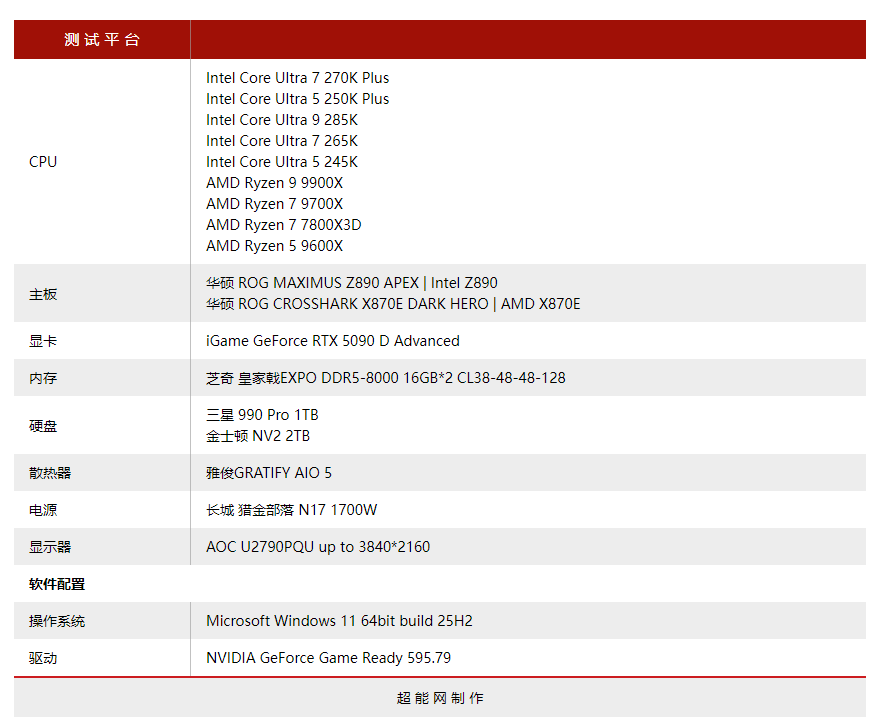 Intel平台使用华硕 ROG MAXIMUS Z890 APEX主板,AMD平台使用华硕 ROG CROSSHAIR X870E DARK HERO主板。其他配件包括雅俊GRATIFY AIO 5一体式水冷散热器,芝奇皇家戟EXPO DDR5-8000 16GB*2 CL34内存,长城猎金部落 N17 1700W电源,显卡则使用iGame GeForce RTX 5090 D Advanced。