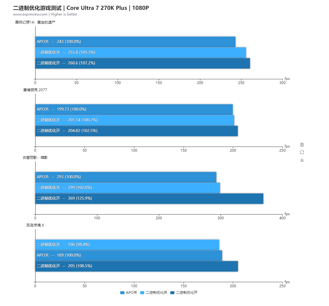 可以看到酷睿Ultra 7 270K Plus的游戏性能确实提升很明显,对比酷睿Ultra 9 285K是全面的领先,特别是那四个支持二进制优化的游戏提升幅度特别大,整体提升幅度达到了8.7%,当然了如果后续酷睿Ultra 9 285K也实装了二进制优化的话提升幅度会低一些,但酷睿Ultra 7 270K Plus整体还是要比酷睿Ultra 9 285K更强。
