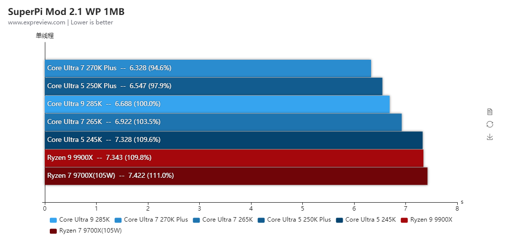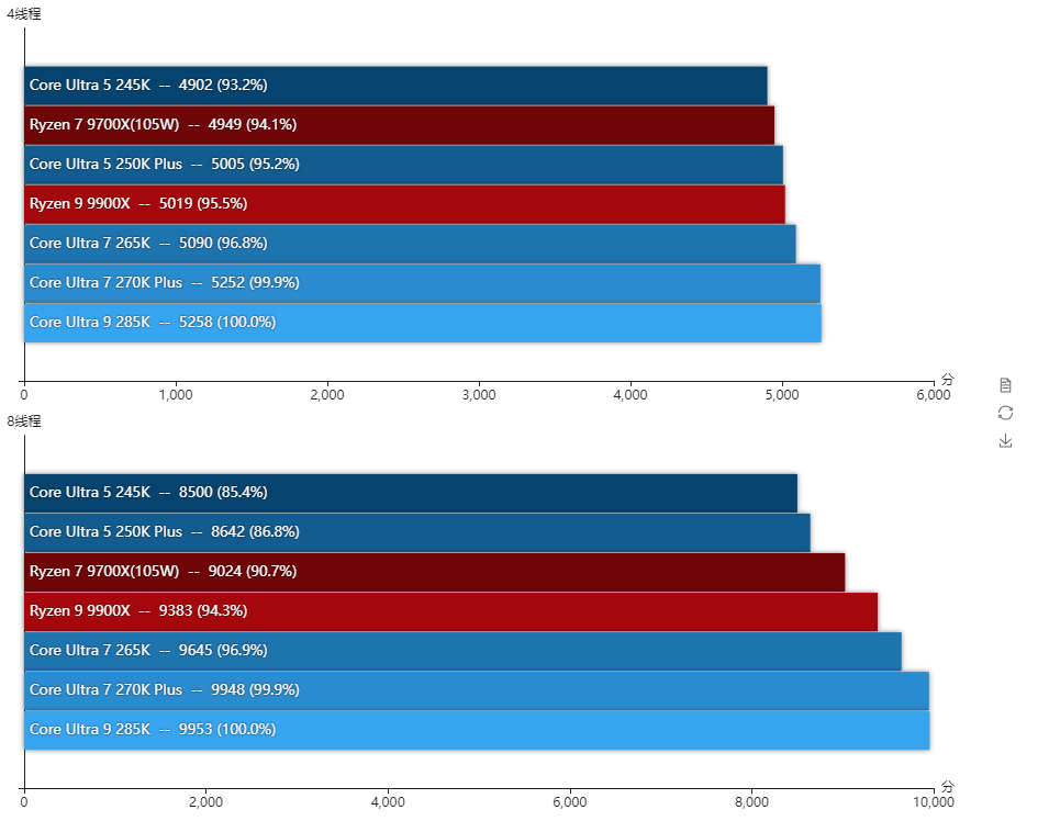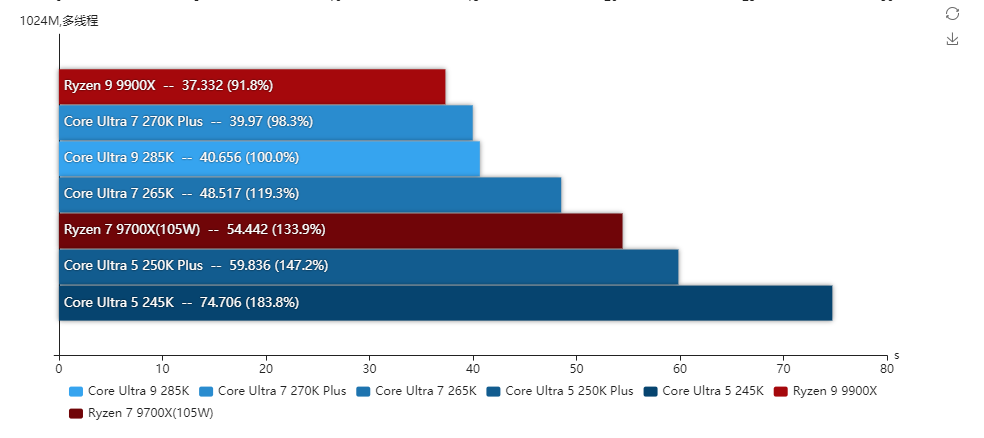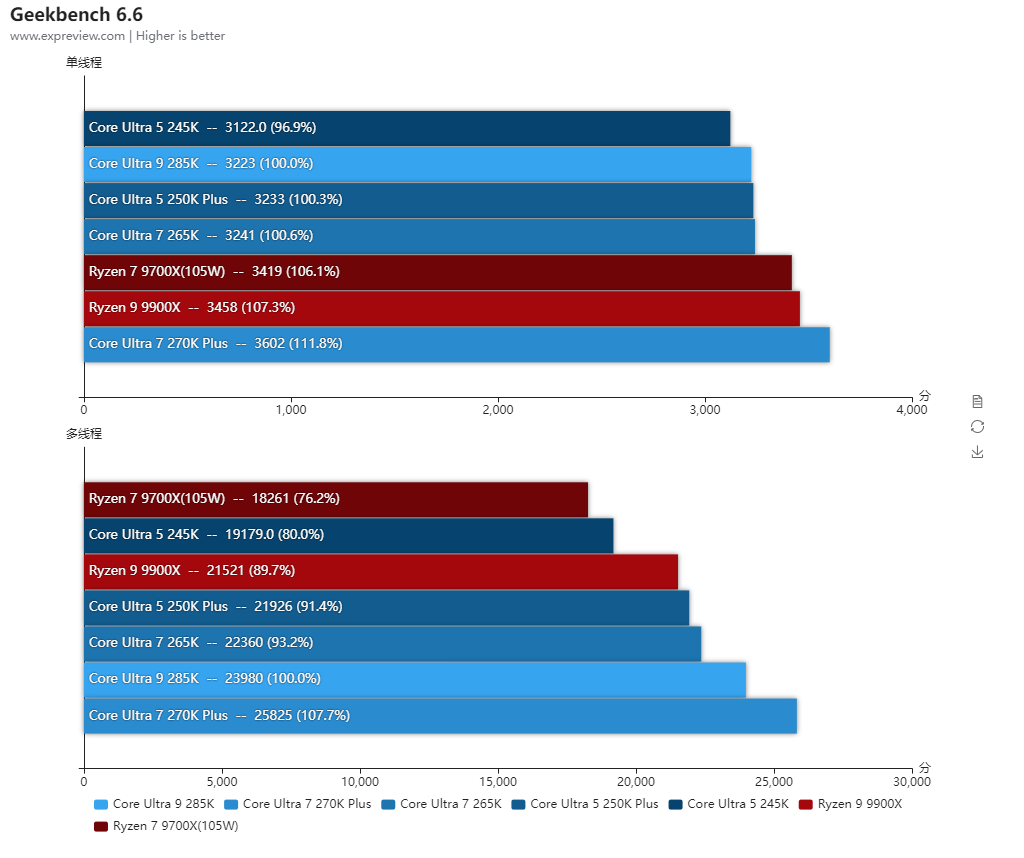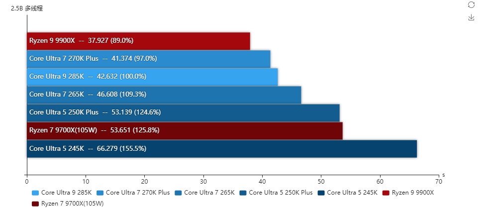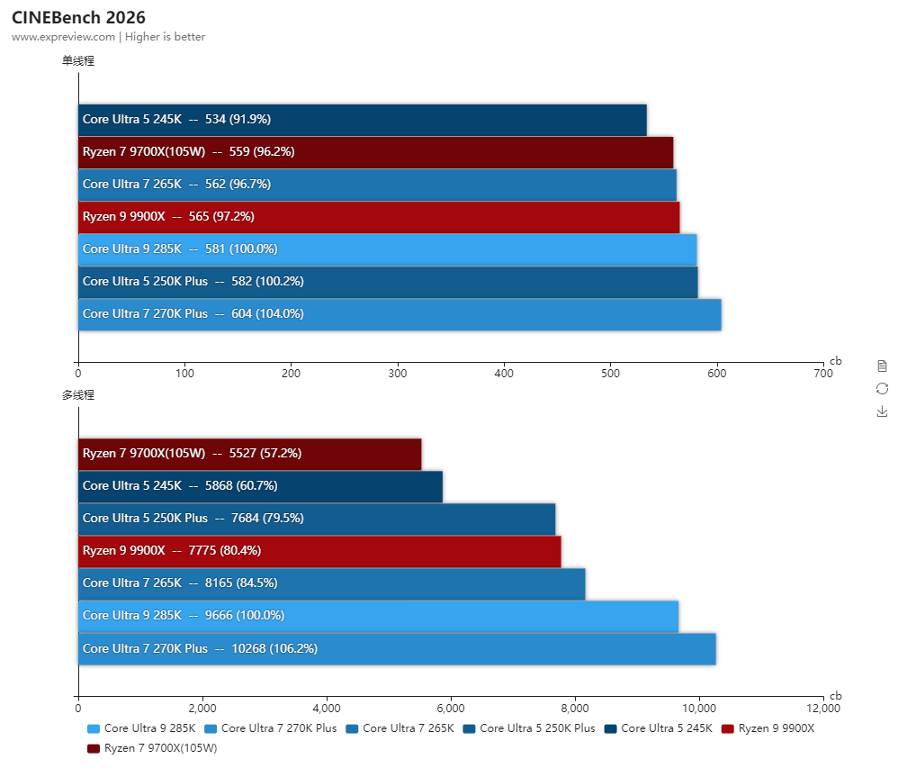 得益于更低的内部延迟,酷睿Ultra 7 270K Plus的整体单线程性能比酷睿Ultra 9 285K还高2.3%,两者的P核全核频率是一样的,而酷睿Ultra 7 270K Plus的E核频率高100MHz,所以多线程也比酷睿Ultra 9 285K高出3.5%。对比酷睿Ultra 7 265K单线程性能提升了4.8%,多线程性能则提升了20.4%,提升幅度相当大。与对手的锐龙9 9900X相比,两者的单线程性能几乎相同,多线程性能是酷睿Ultra 7 270K Plus高出18.6%之多。