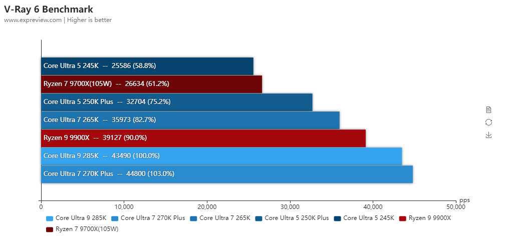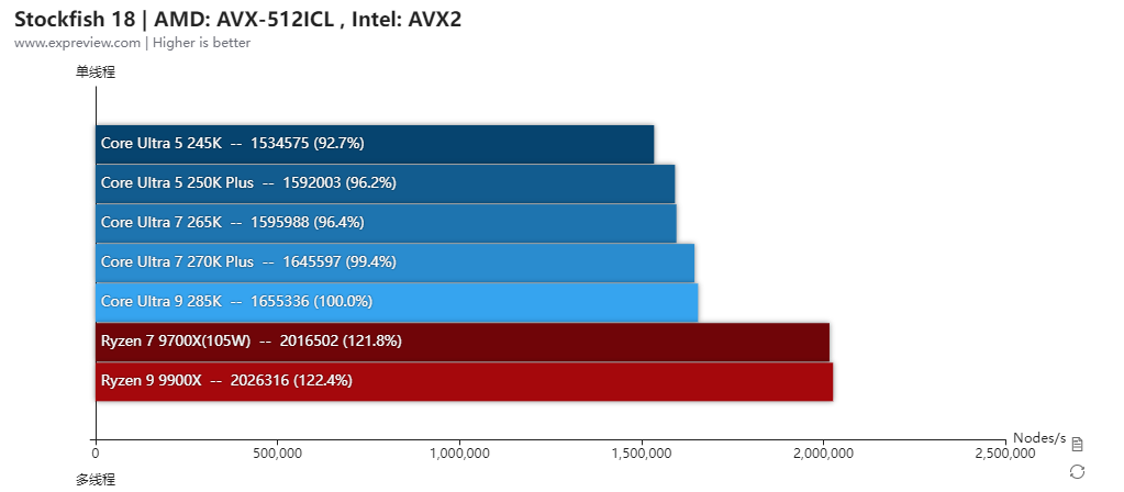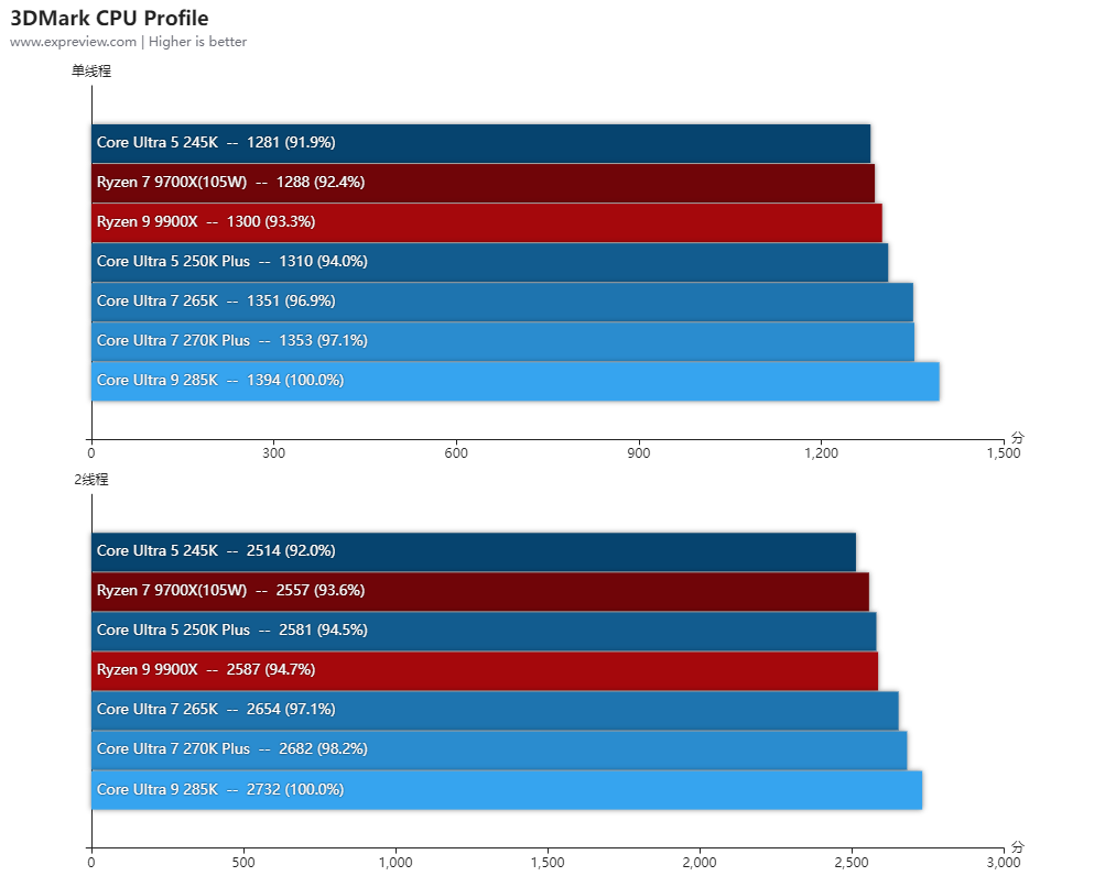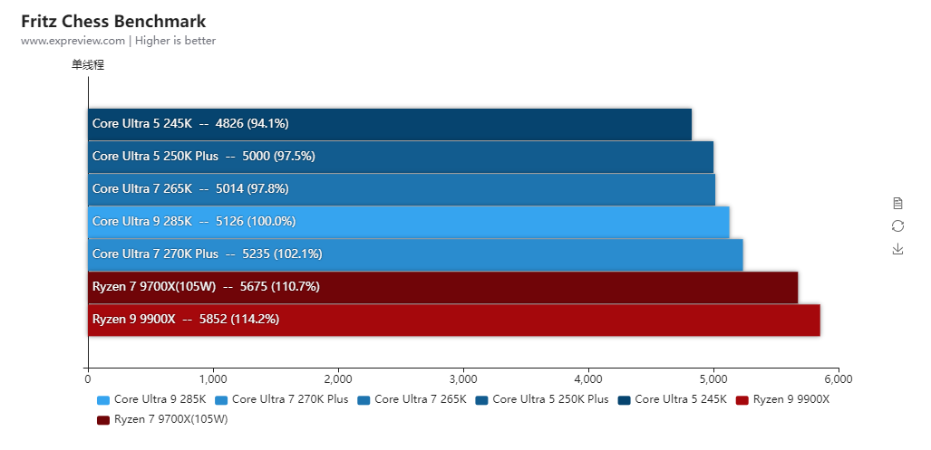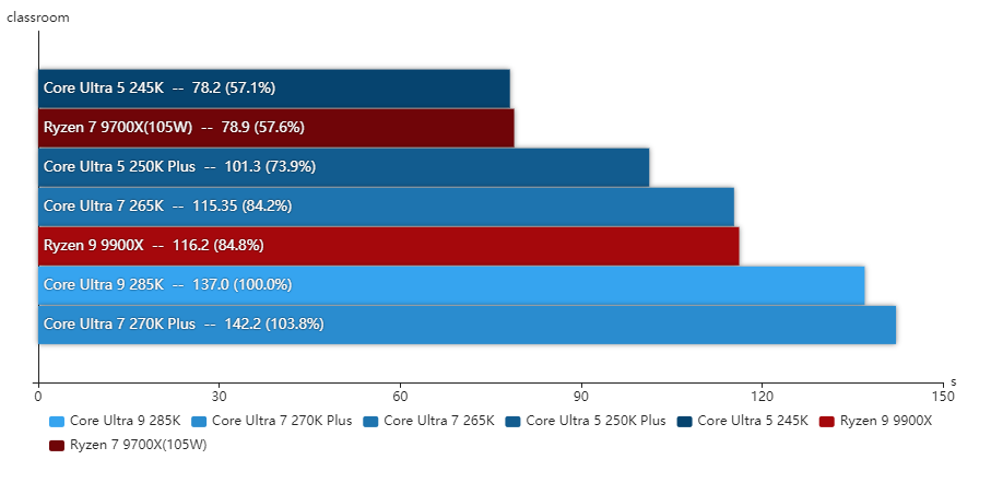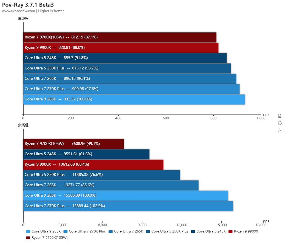 得益于更低的内部延迟,酷睿Ultra 7 270K Plus的整体单线程性能比酷睿Ultra 9 285K还高2.3%,两者的P核全核频率是一样的,而酷睿Ultra 7 270K Plus的E核频率高100MHz,所以多线程也比酷睿Ultra 9 285K高出3.5%。对比酷睿Ultra 7 265K单线程性能提升了4.8%,多线程性能则提升了20.4%,提升幅度相当大。与对手的锐龙9 9900X相比,两者的单线程性能几乎相同,多线程性能是酷睿Ultra 7 270K Plus高出18.6%之多。