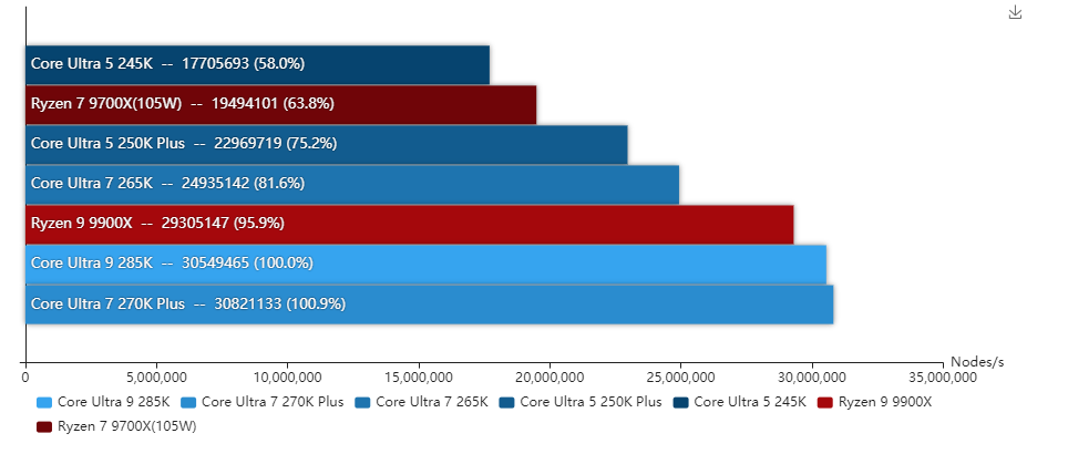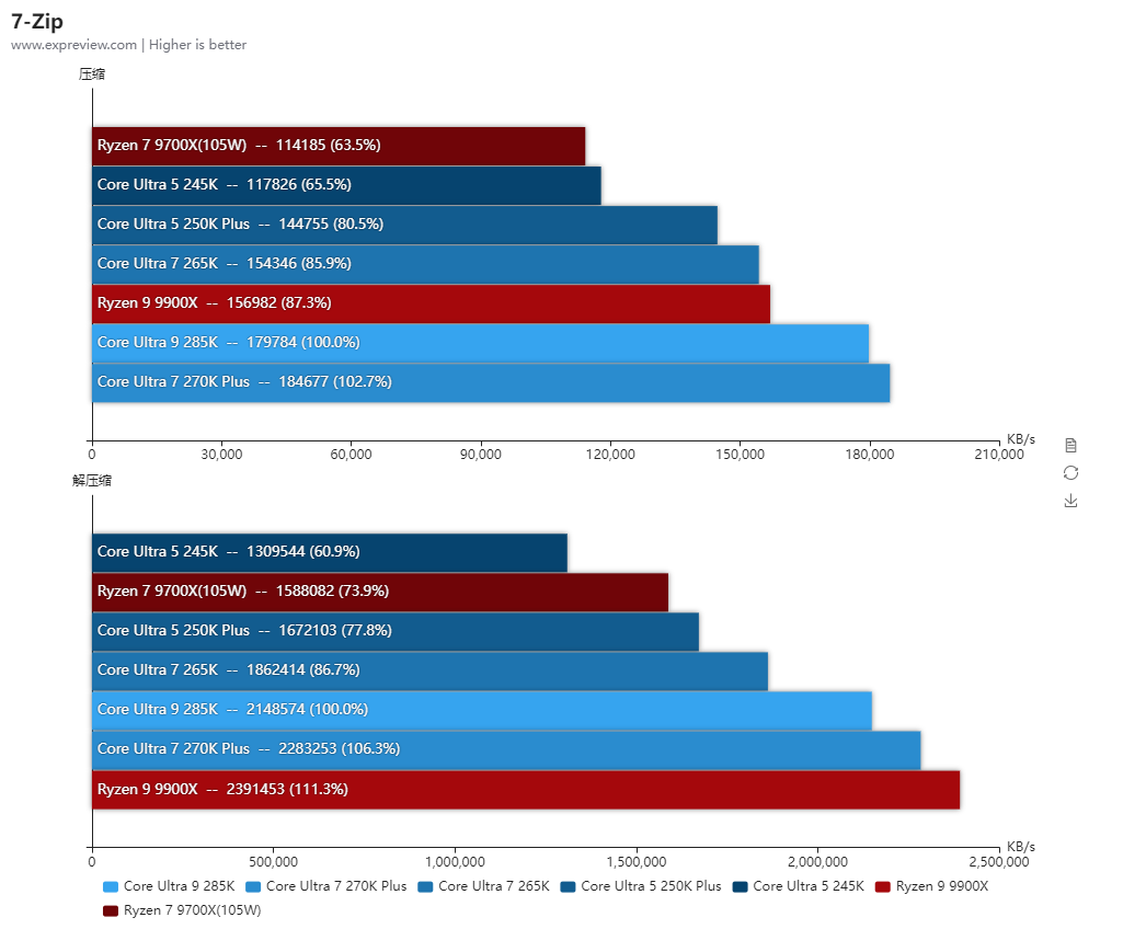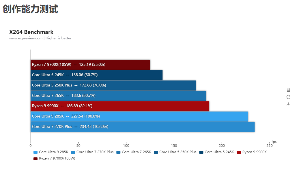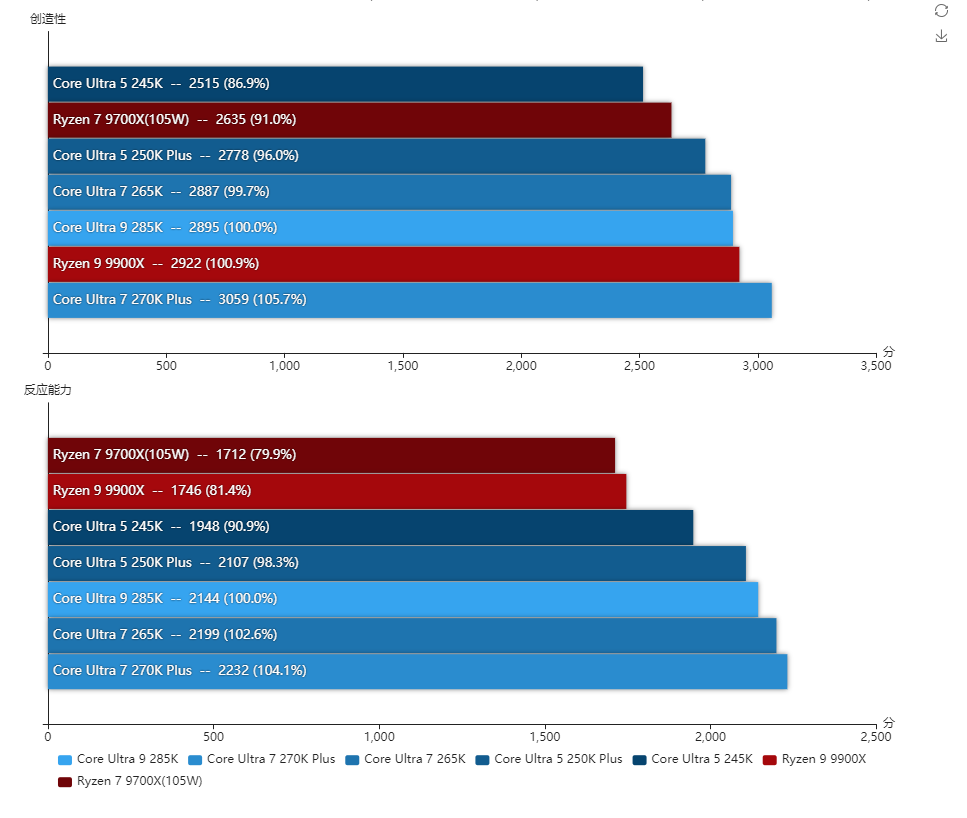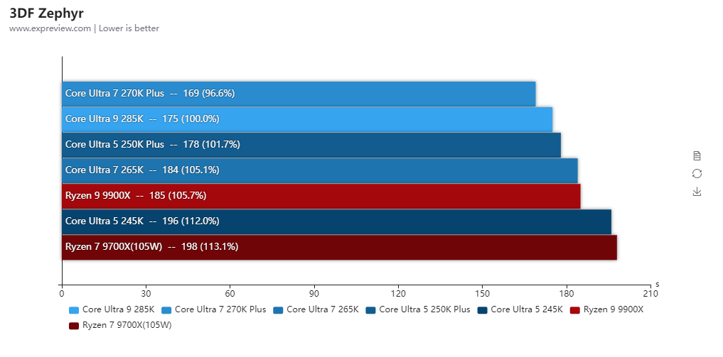 酷睿Ultra 7 270K Plus和酷睿Ultra 5 250K Plus其实也可以解锁功耗的,但由于性能变化幅度不大,所以基准性能测试就只放它们的默认性能,而锐龙7 9700X和锐龙5 9600X则全程开着105W cTDP模式进行测试。