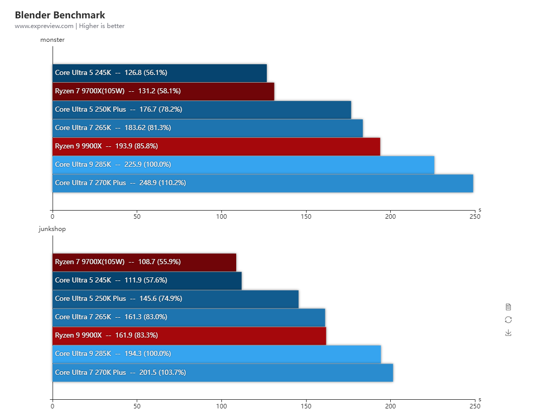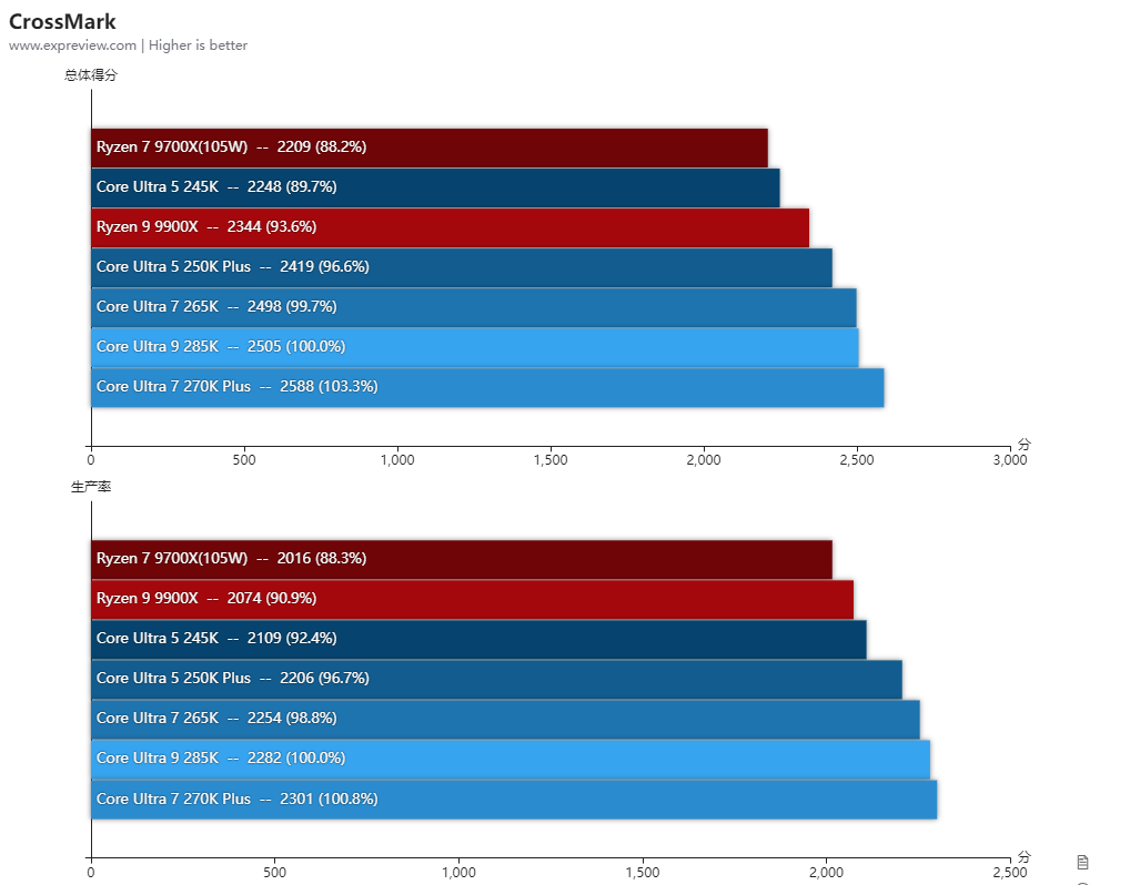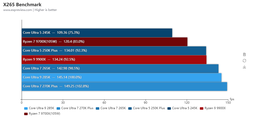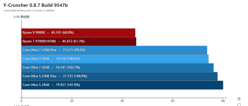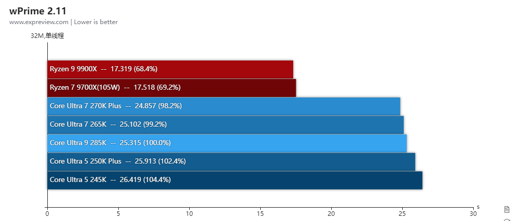 酷睿Ultra 7 270K Plus和酷睿Ultra 5 250K Plus其实也可以解锁功耗的,但由于性能变化幅度不大,所以基准性能测试就只放它们的默认性能,而锐龙7 9700X和锐龙5 9600X则全程开着105W cTDP模式进行测试。