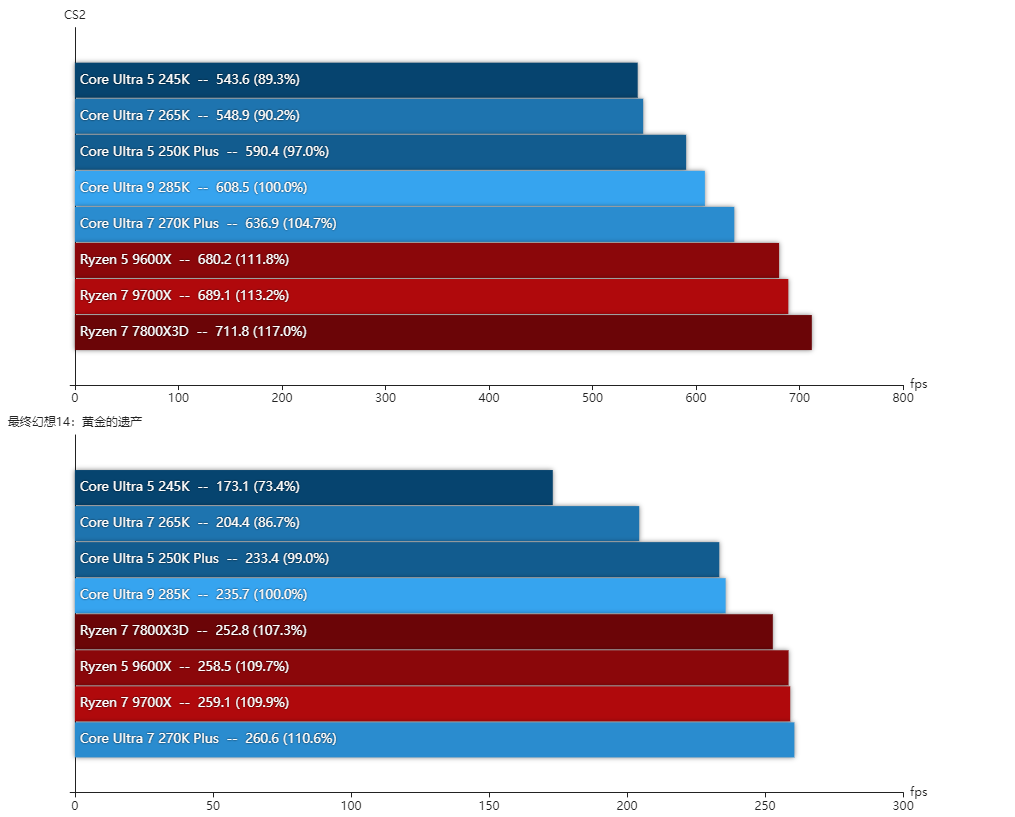 与对手相比的话,酷睿Ultra 7 270K Plus其实也就是CS2这项明显比锐龙7 9700X要低一些,测试的10款游戏里面有4款是有两位数的领先的,平均下来游戏性能高7%左右。对比锐龙7 7800X3D这颗价格差不多的游戏处理器的话,《CS2》与《DOTA2》这两款电竞网游确实是X3D处理器的优势,但其他游戏基本都是酷睿Ultra 7 270K Plus占优,整体算下来两者游戏性能其实差不多。