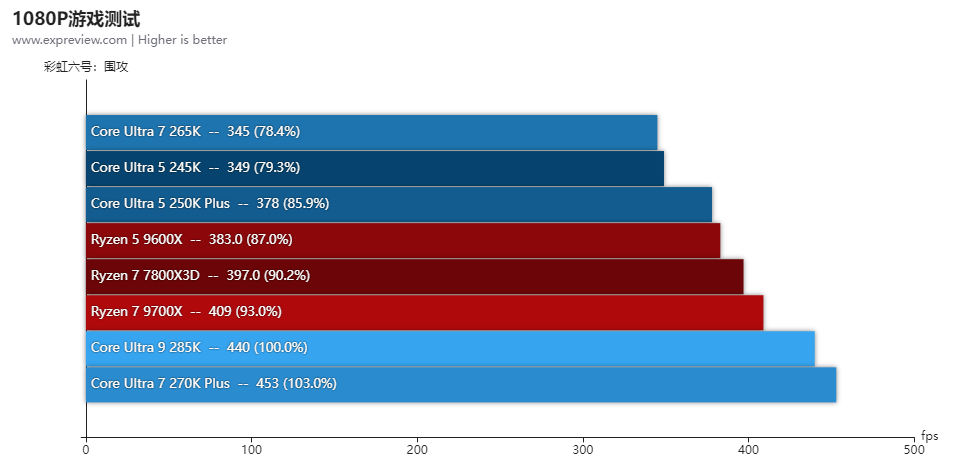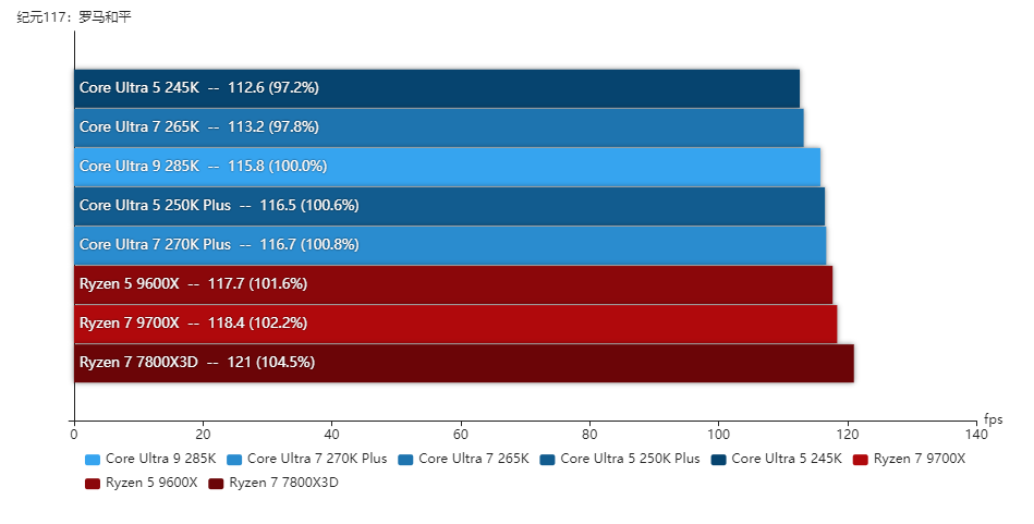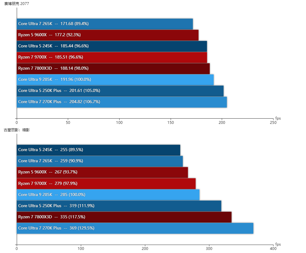 在提高各个内部总线与接口频率之后,酷睿Ultra 200S Plus的游戏性能有了相当明显的提升,再加上新的二进制优化技术加持,酷睿Ultra 7 270K Plus的游戏性能已经超越了酷睿Ultra 9 285K,整体表现优于对手的锐龙7 9700X,略优于锐龙7 7800X3D。酷睿Ultra 5 250K Plus的游戏表现已经优于酷睿Ultra 7 265K,整体和锐龙5 9600X差不多。