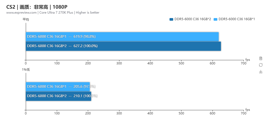 我们还用《CS2》简单对比了一下酷睿Ultra 7 270K Plus在使用单通道和双通道内存时的游戏性能差异,这个问题以前可以忽略,但内存价格飞涨的现在就不容忽视了,在这里我们也换了一套更为常规的DDR5-6000 C36内存。可以看到在使用单通道内存时游戏的平均帧率只降低了1.2%,1%低帧率也只降低了2.1%,影响并不大。