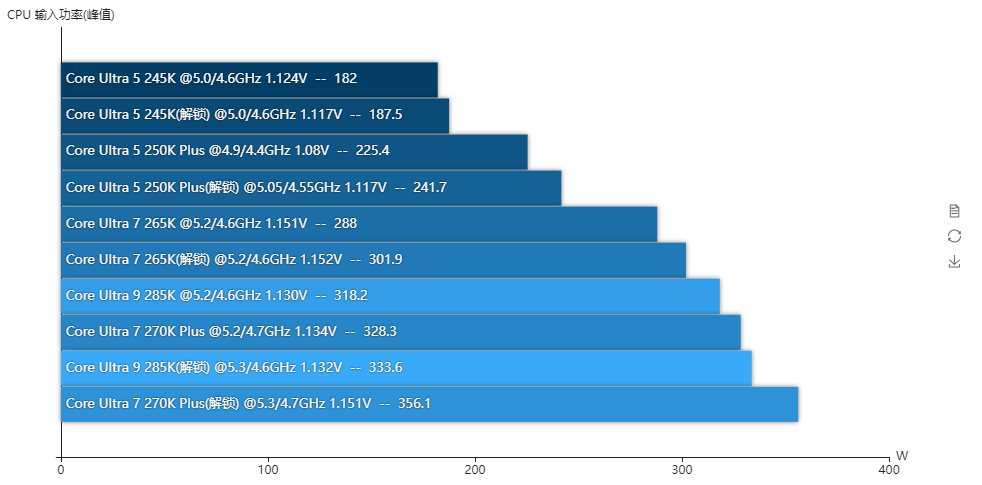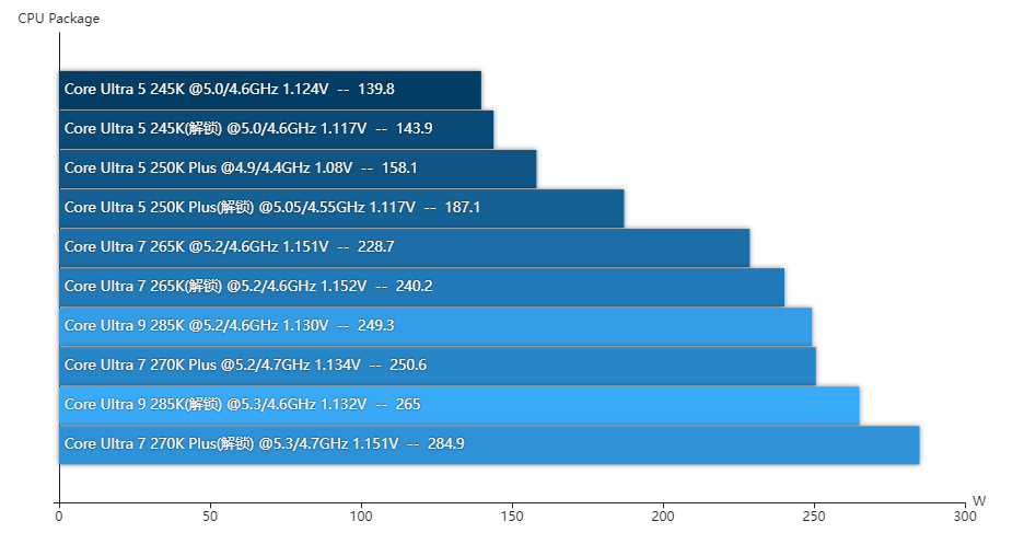解锁功耗限制后,酷睿Ultra 7 270K Plus的P核频率与酷睿Ultra 9 285K是一样的,但E核频率高了100MHz,所以电压也高一些,所以它的烤机功耗比酷睿Ultra 9 285K还要高,来到了285W,此时它的温度也到了93℃,这温度其实蛮高的。而酷睿Ultra 5 250K Plus即使解锁功耗限制后频率也没跑满,可能还有什么限制,我可以确定我已经把CPU内核电流限制也解除了,解锁功耗后它烤机时能跑到187W,此时它的温度是78℃,并不算高。