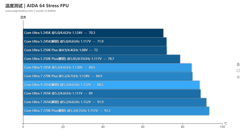 此前的酷睿Ultra 7 265K与酷睿Ultra 5 245K在默认设置时其实是跑不到功耗上限的,现在的酷睿Ultra 7 270K Plus和酷睿Ultra 5 250K Plus由于多了4个E核加上频率提升,现在他们默认时都能触碰到各自的功耗上限。在默认时酷睿Ultra 7 270K Plus的烤机温度和酷睿Ultra 9 285K差不多,都是85℃低一点,而酷睿Ultra 5 250K Plus则比酷睿Ultra 5 245K高一点,有72℃,两者的默认温度功耗都不高。
