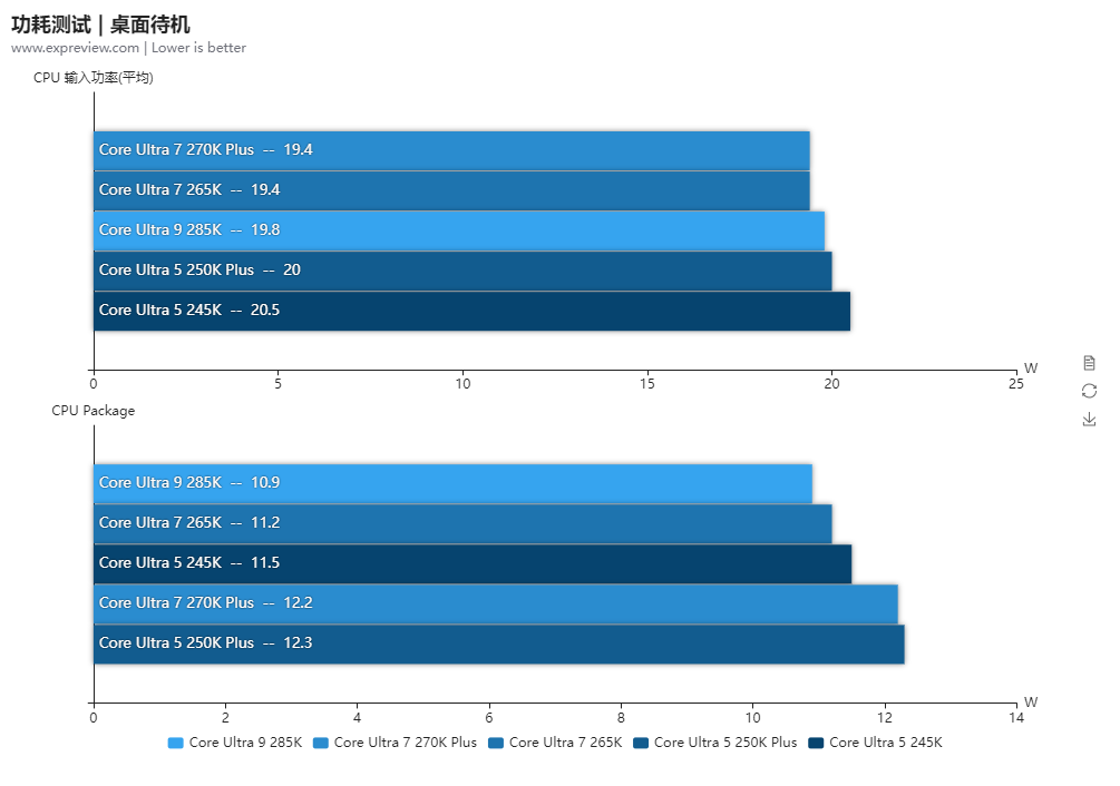待机并不是完全的桌面待机,而是开着HWinfo监控着,Windows的电源计划选的是平衡。两颗酷睿Ultra 200S Plus的待机功耗都比原来的三颗高1W左右,应该是D2D与NGU频率提高带来的影响,温度方面则没啥太大变化。