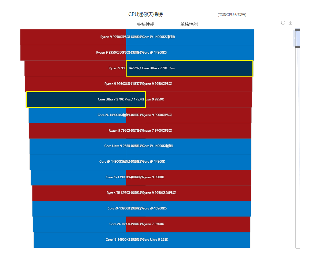 从我们的处理器天梯榜就能看到酷睿Ultra 7 270K Plus无论单线程还是多线程性能都超过了酷睿Ultra 9 285K,和酷睿Ultra 7 265K相比的话多线程性能更是提升了20%之多。与对手价格较为接近的锐龙9 9900X相比两者的单线程性能接近,但多线程性能酷睿Ultra 7 270K Plus比锐龙9 9900X开了PBO后还要高不少。