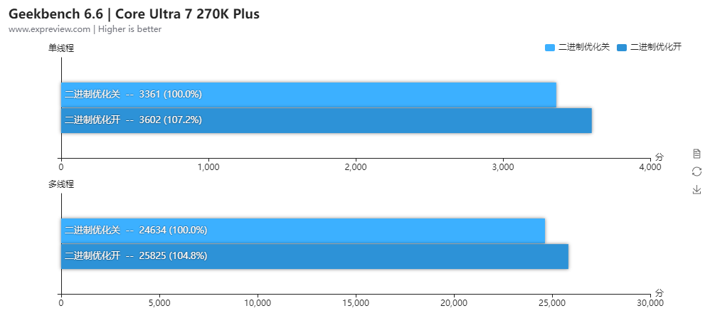 酷睿Ultra 7 270K Plus开启二进制优化后,Geekbench 6的单线程得分提升了7.2%,多线程得分提升了4.8%,在软件里面打开开关就能获得明显的性能提升,这优化还是很有用的。