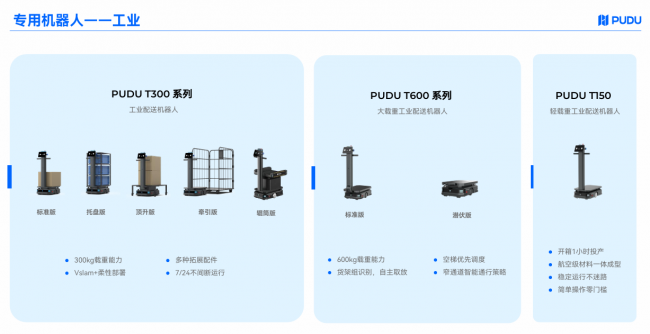 PUDU T600系列负载达600kg,提供标准版与潜伏版双形态,适配重型物料搬运与狭窄空间仓储场景。