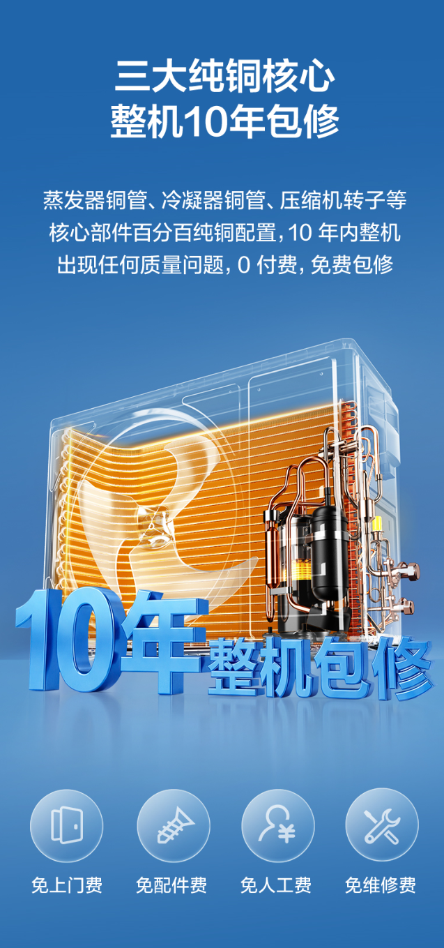 除此之外,TCL小蓝翼·全域风Pro AI健康舒适空调覆盖全场景家居需求,宽温域智能除湿轻松应对梅雨季、回南天、桑拿天等高湿环境,恒温除湿、低温除湿多模式智能切换,长效维持室内干爽。此外,TCL小蓝翼·全域风Pro AI健康舒适空调兼容鸿蒙智联、华为、Siri 等多生态互联,人车家无缝联动,免密快连技术让智能操控更便捷。而蒸发器、冷凝器、压缩机三大核心部件全纯铜配置,整机10年免费包修,以硬核品质筑牢用户安心体验。